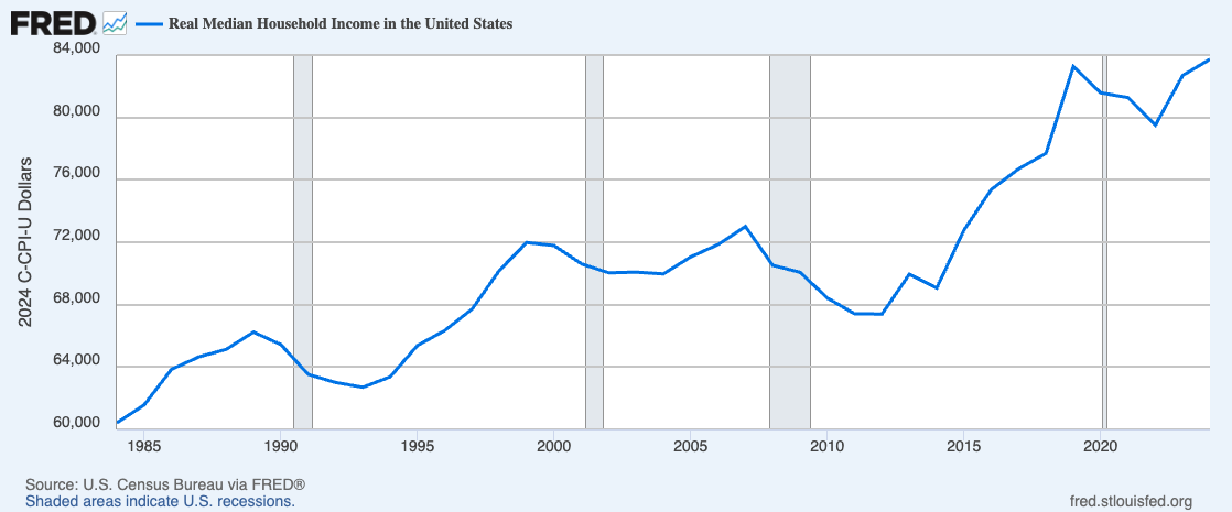 Here’s a graph of the changes in median household income in the United States since 1985:
