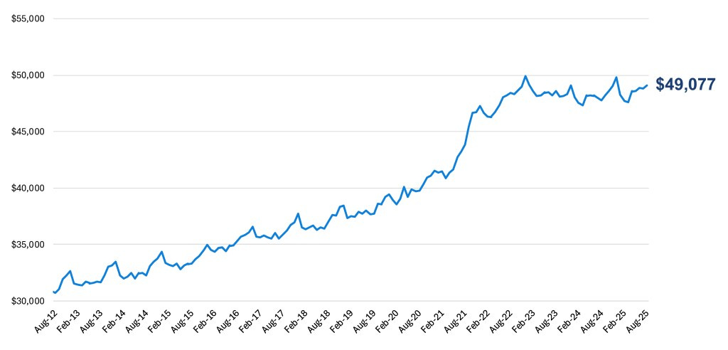 In short, new vehicle prices are up about 23% since 2020, while median household income is more or less flat over the same period.